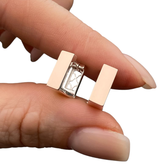 Ці вишукані срібні сережки з золотими вставками — справжнє поєднання мінімалізму, сучасного дизайну та елегантності. Геометрична форма з ідеально рівними лініями створює стильний акцент, а теплий блиск золота додає прикрасі преміального вигляду.