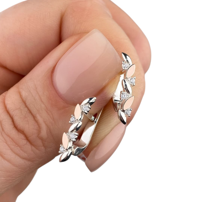 Жіночі срібні сережки «Лісова Ніжність» з золотими вставками та кубічним цирконом на англійській застібці